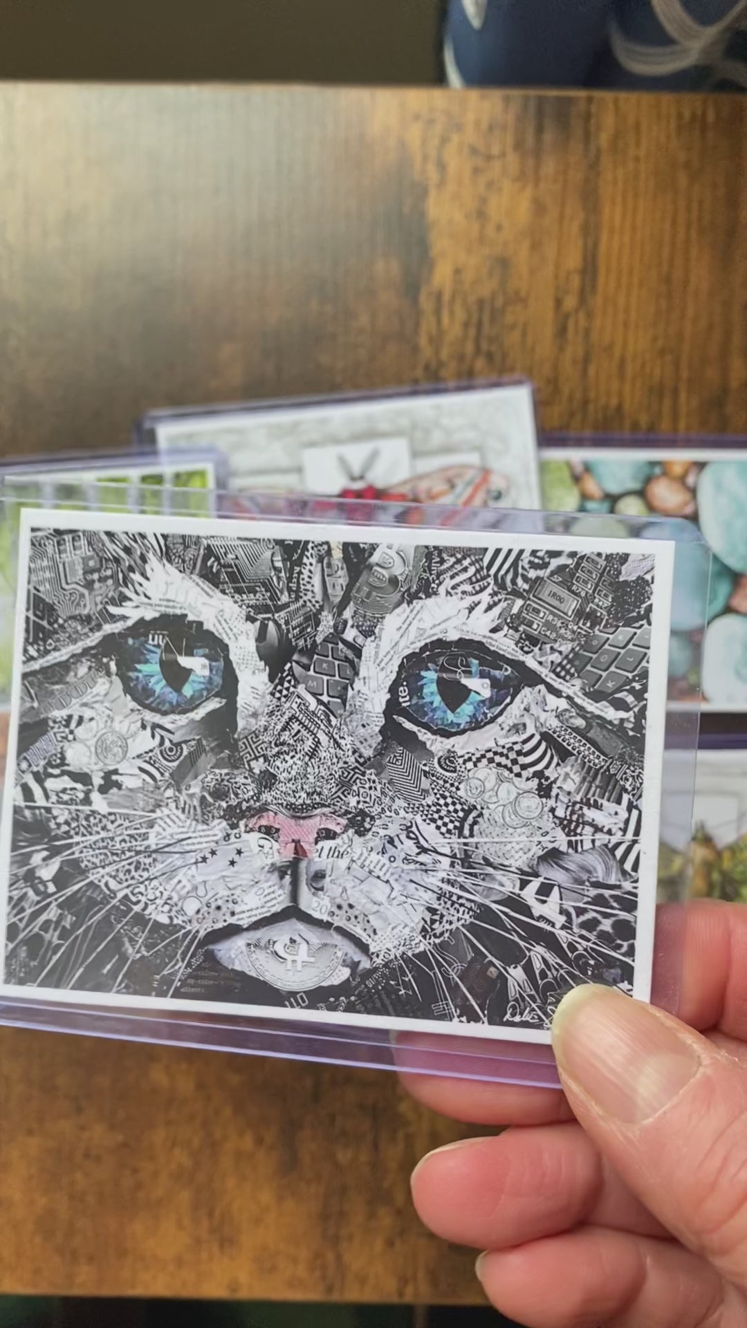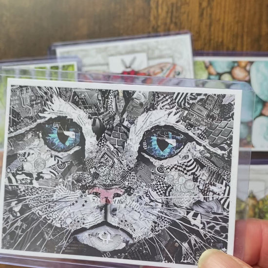 This ACEO of a black and white cat is a giclee print of an original collage, created from bits of magazines, during my collage phase from 2013-2025. This cat also has coins, bills, and crypto currency digitally added. It has been cropped from the original to either fit the ACEO standard ratio or to highlight a portion of the collage, so the individual pieces are easier to see in this small format.