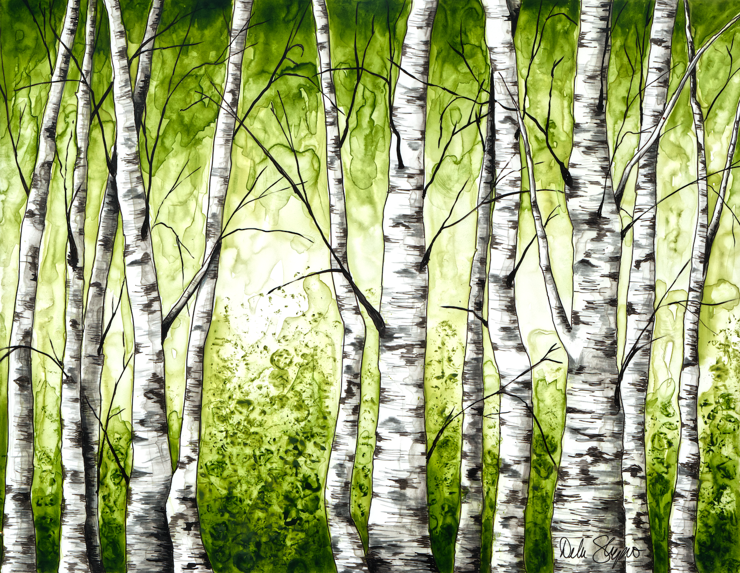 This ACEO of a birch trees is a giclee print of an original acrylic ink painting on Yupo paper. It has been cropped from the original to either fit the ACEO standard ratio or to highlight a portion of the artwork