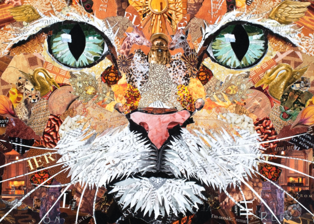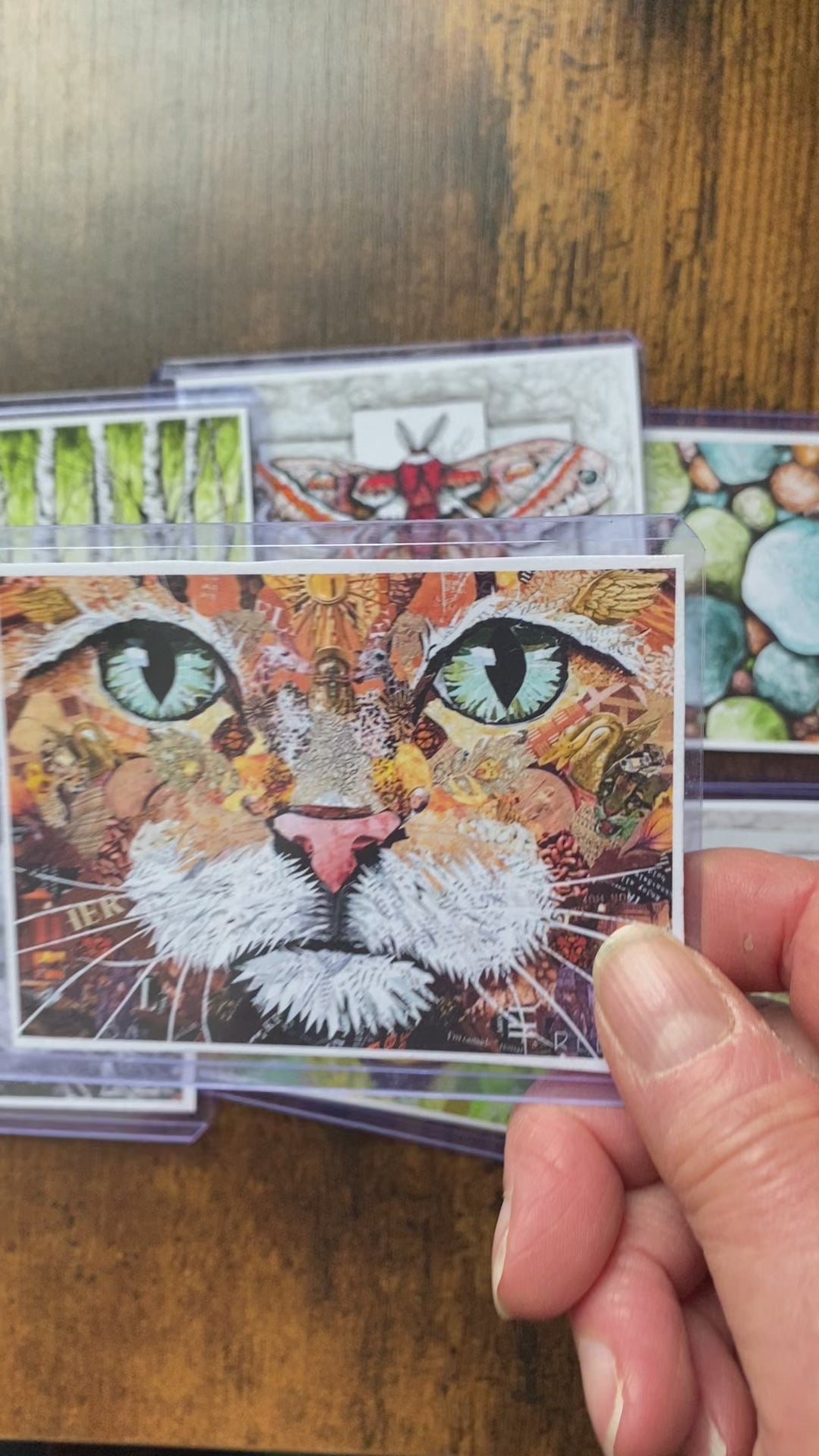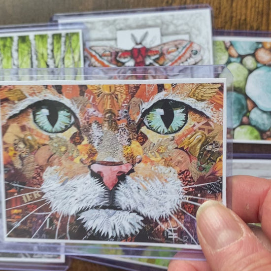 This ACEO card of a orange tabby cat is a giclee print of an original collage, created from bits of magazines, during my collage phase from 2013-2025. It has been cropped from the original to either fit the ACEO standard ratio or to highlight a portion of the collage, so the individual pieces can be seen more easily in this small print.