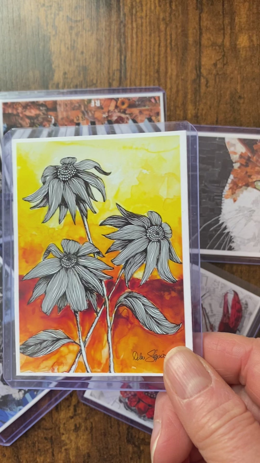 This ACEO of a pen drawing black eye susans is a giclee print of an original acrylic ink painting on Yupo paper. It has been cropped from the original to either fit the ACEO standard ratio or to highlight a portion of the artwork