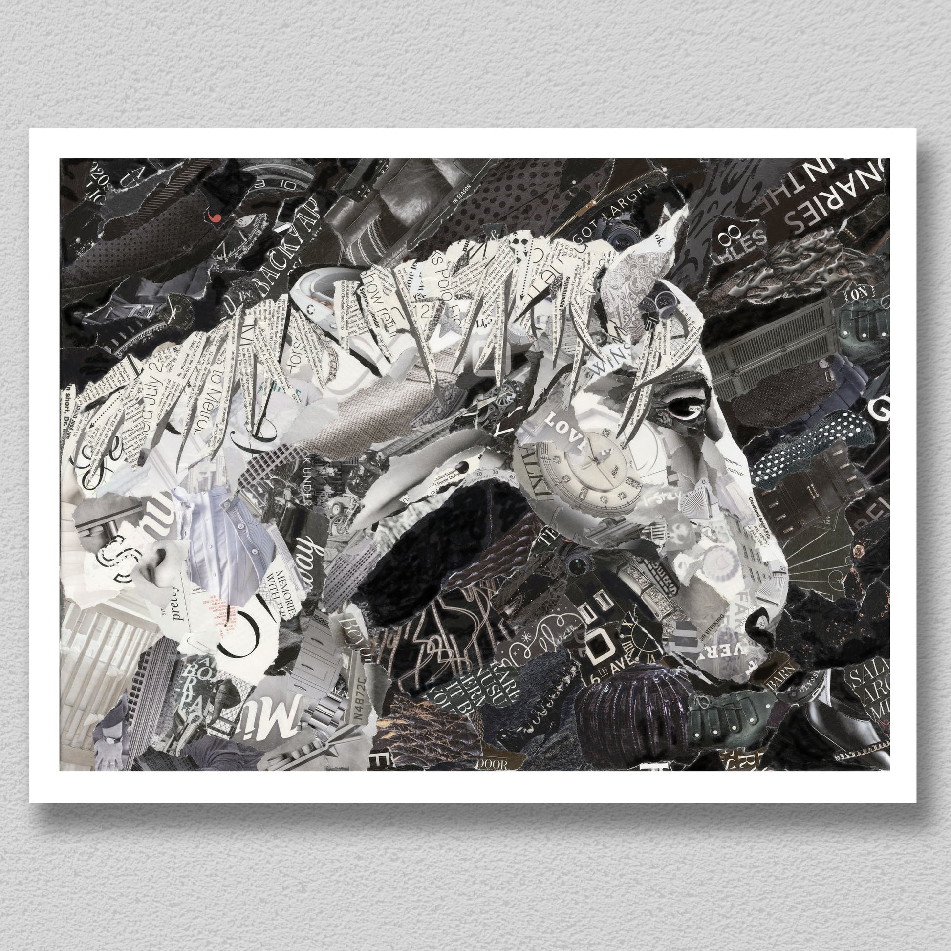 A white/grey horse on a black background. It almost looks like this horse is looking at you. Wondering about the name? In Greek Mythology, Chione was the Goddess of Snow.