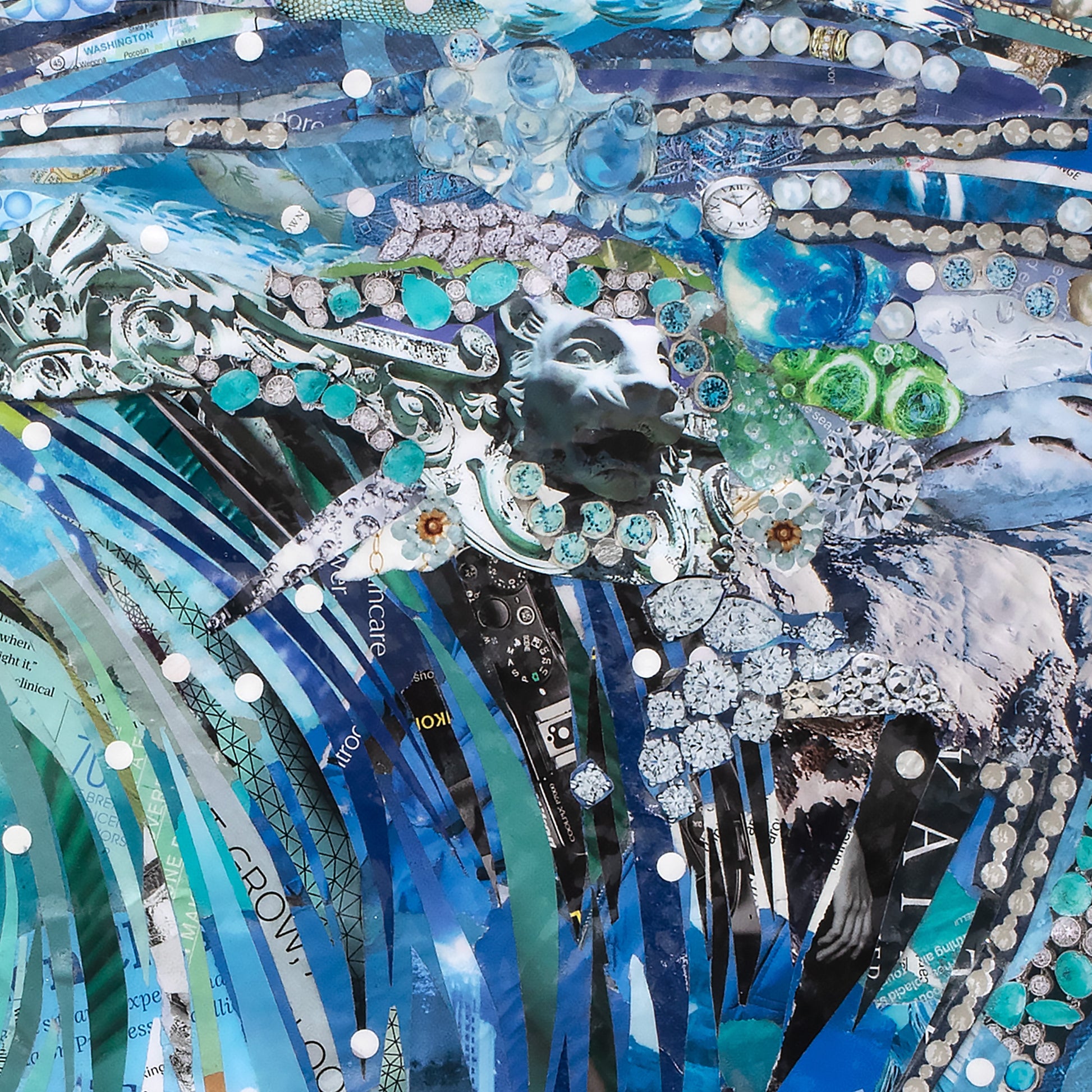 In this collage you will find a scuba diver, a lion's head, a car, pajamas, diamonds and pearls. Besides my usual magazine paper, I also used maps, wallpaper, and tissue paper.