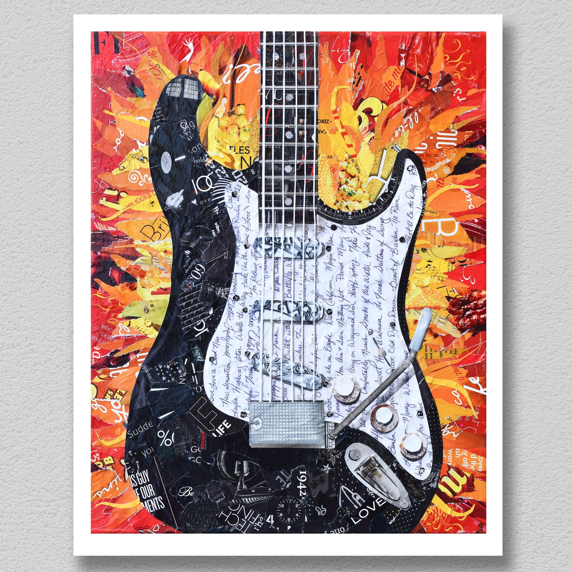 I designed this one so it could be hung one of three ways: with the neck towards the left or towards the right or straight up. This collage was inspired by Jimi Hendrix. He set his guitars on fire, which explains the background. Within the white part of this guitar are hand written, famous songs that have been played on a stratocaster from various bands. Three of the songs by Jimi Hendrix are written upside down because he was left handed and played his guitars upside down. Depending on how you would like to hang it, will depend on what you can or can not easily read.