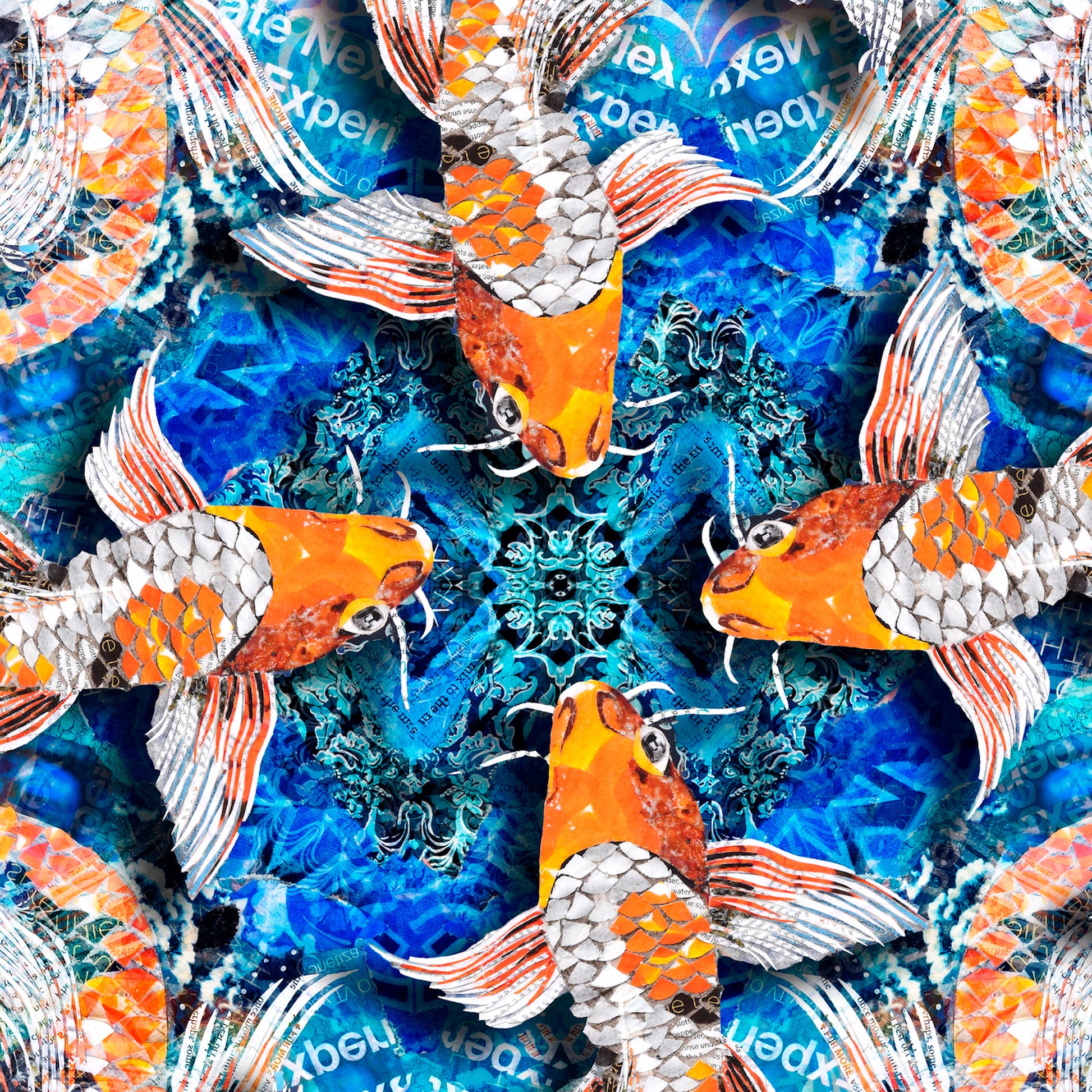 This collage was created somewhat digitally. I took my collage of a koi fish and then duplicated it digitally to create this mandala effect.