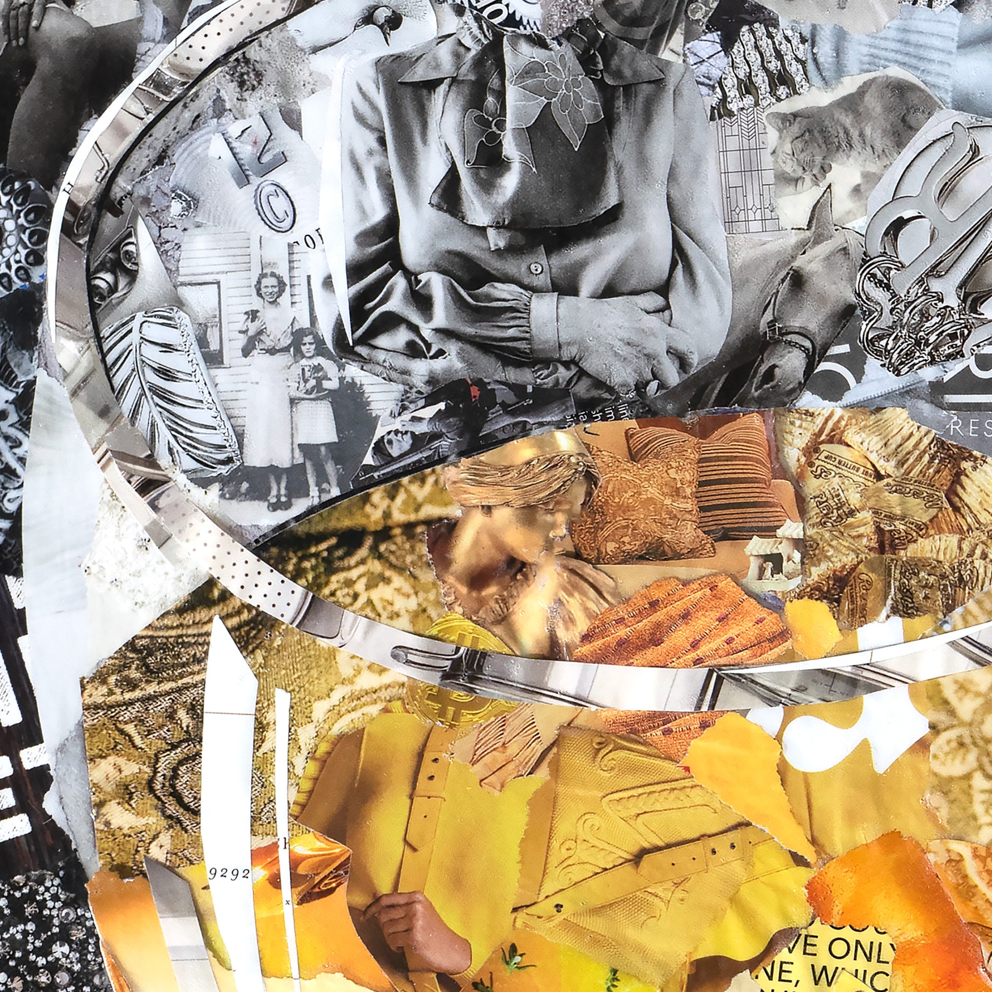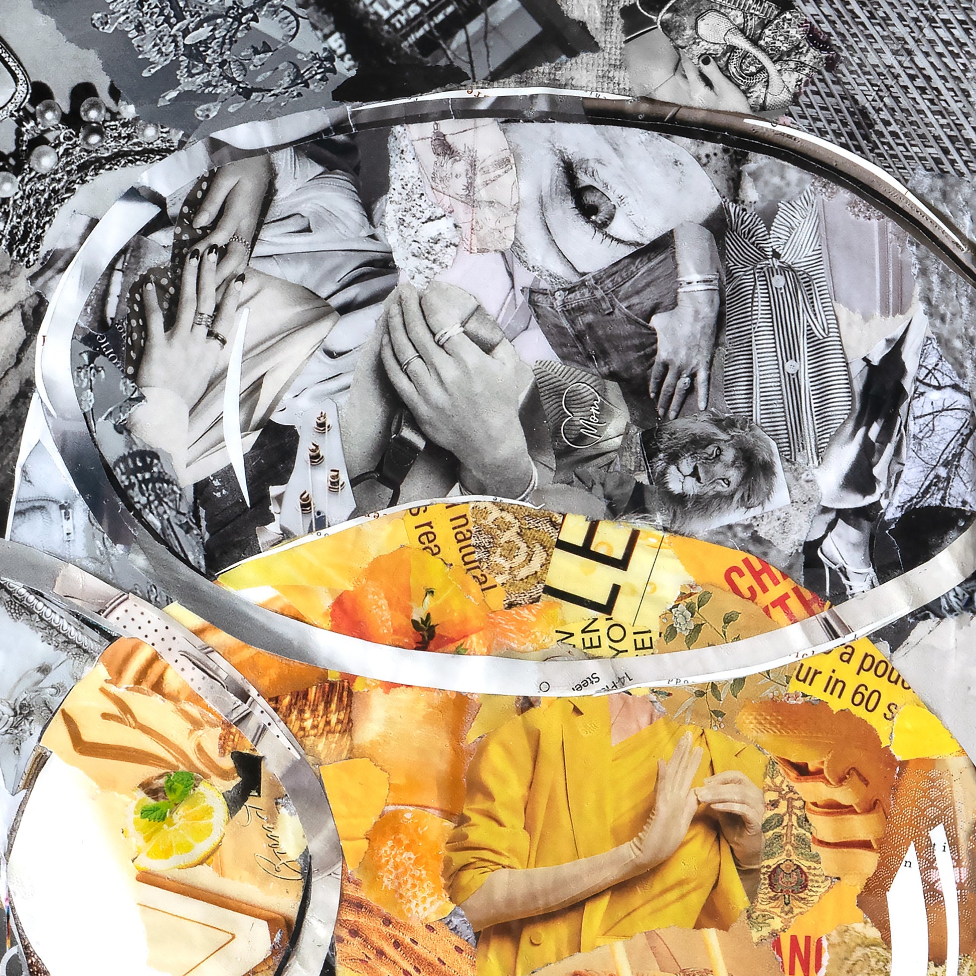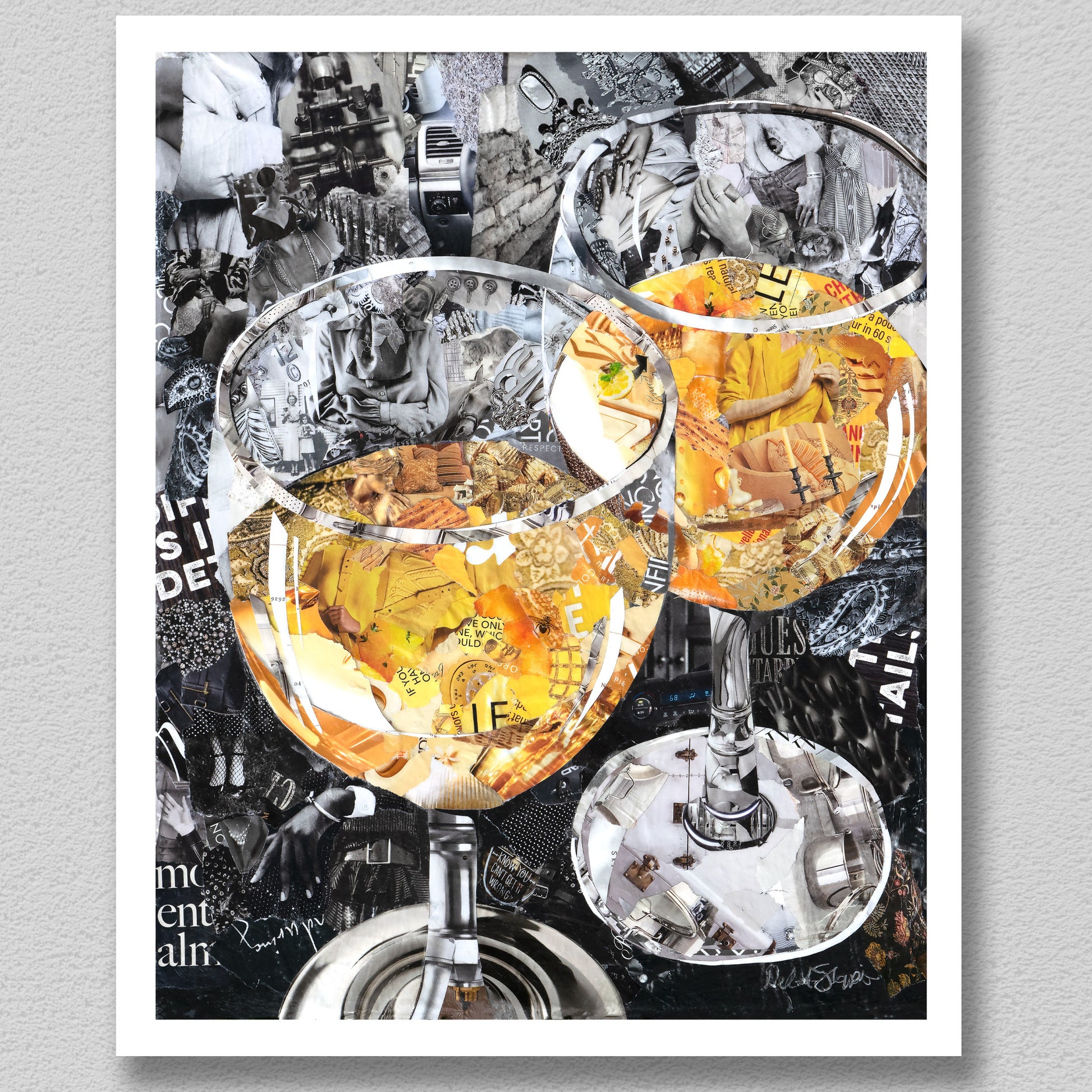 Original artwork is created from magazine pages and glued onto a stretched canvas topped with protective layers. Each is signed, mounted in a black floating frame unless noted, and is ready for hanging with attached hardware. A certificate of Authenticity will be included with the original along with care instructions.