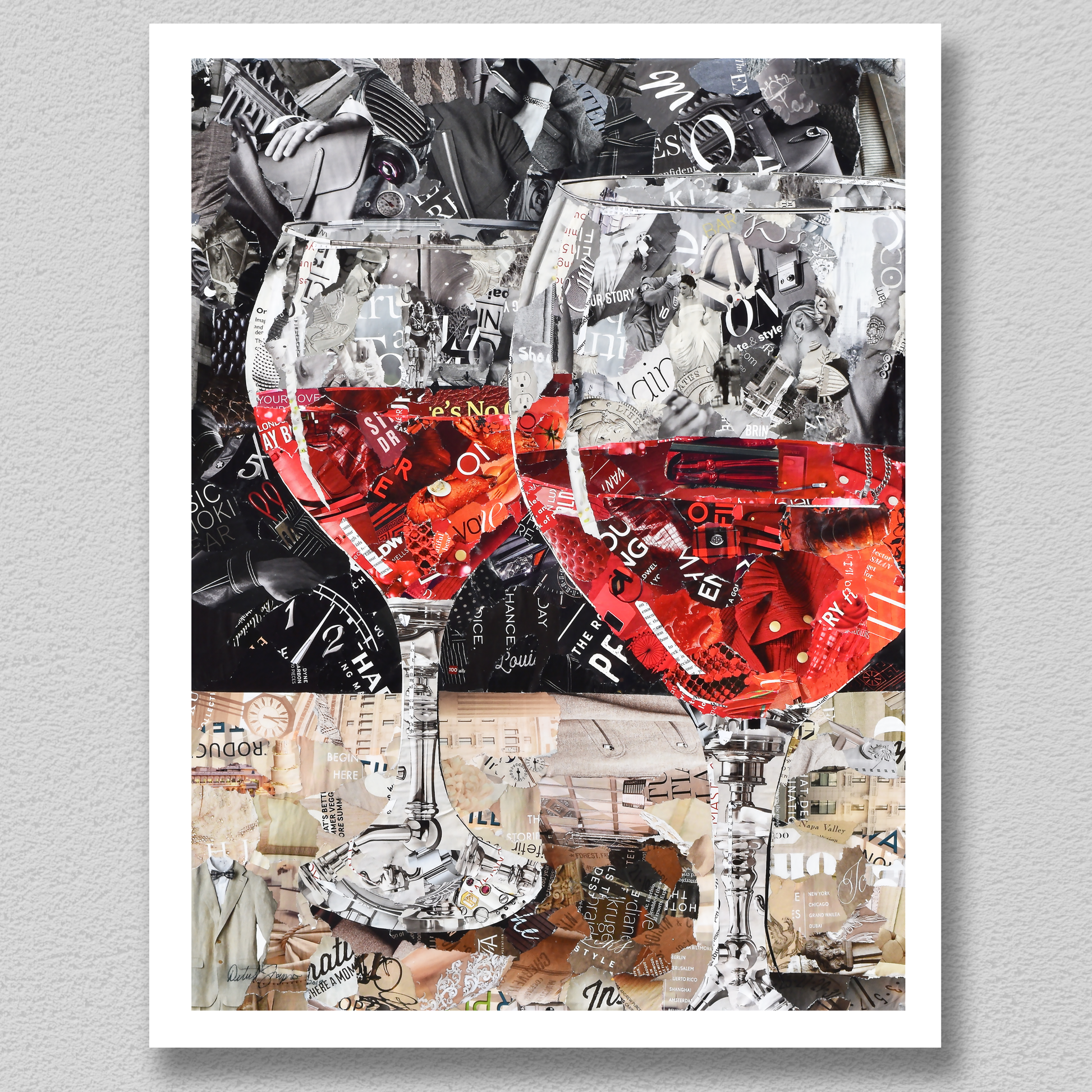 Collage of two glasses of red wine. Lots of images to look for in this one.